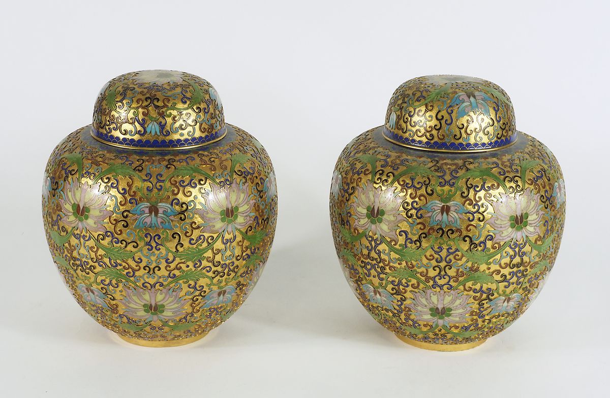 Coppia di vasi a boccia a lavorazione cloisonnè decorati a motivi orientaleggianti. H. cm. 24.