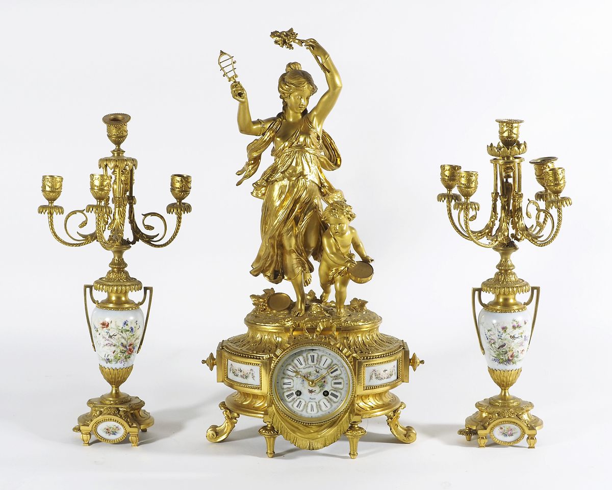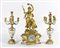 Trittico composto da orologio da tavolo in bronzo dorato con applicazioni di placche in porcellana decorata a motivi floreali e paio di candelieri in bronzo dorato a 5 luci con fusto in porcellana policroma decorata a motivi floreali. XIX secolo. H. max cm. 60. (difetti). XIX sec