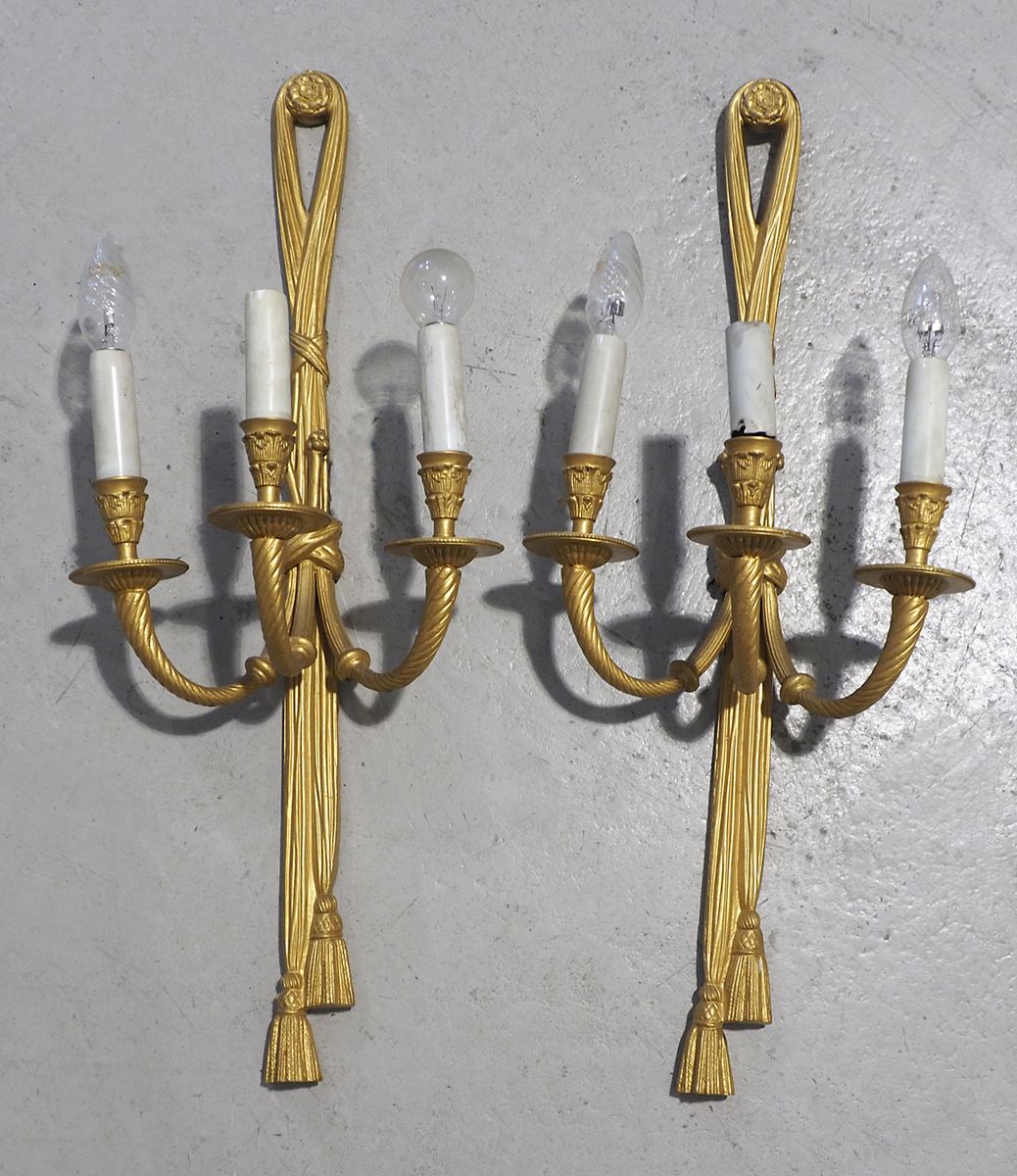 Paio di appliques in bronzo dorato a 3 luci. H. cm. 60.