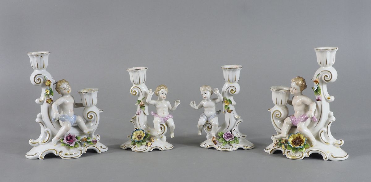 Lotto di 2 coppie di candelabri in porcellana policroma con figure di putti. H. max cm. 17.