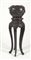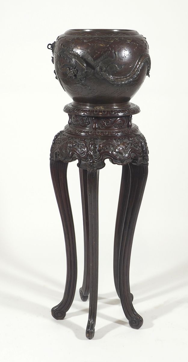 Cachepo in bronzo con decori a motivi di draghi orientali poggiante su colonna in legno scuro decorata a motivi orientali. H. tot cm. 130. Inizio XX sec.