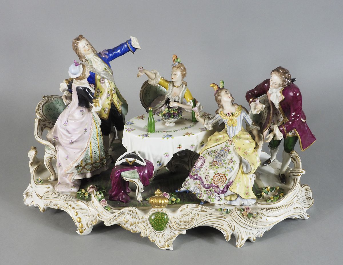 Grande gruppo in porcellana policroma raffigurante festa con bevitori. Lung. cm. 49. (difetti e mancanze).