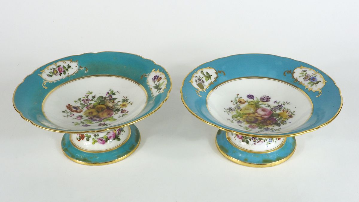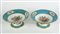 Coppia di alzate in porcellana policroma decorate a motivi floreali. H. cm. 9, diam. cm. 22.