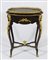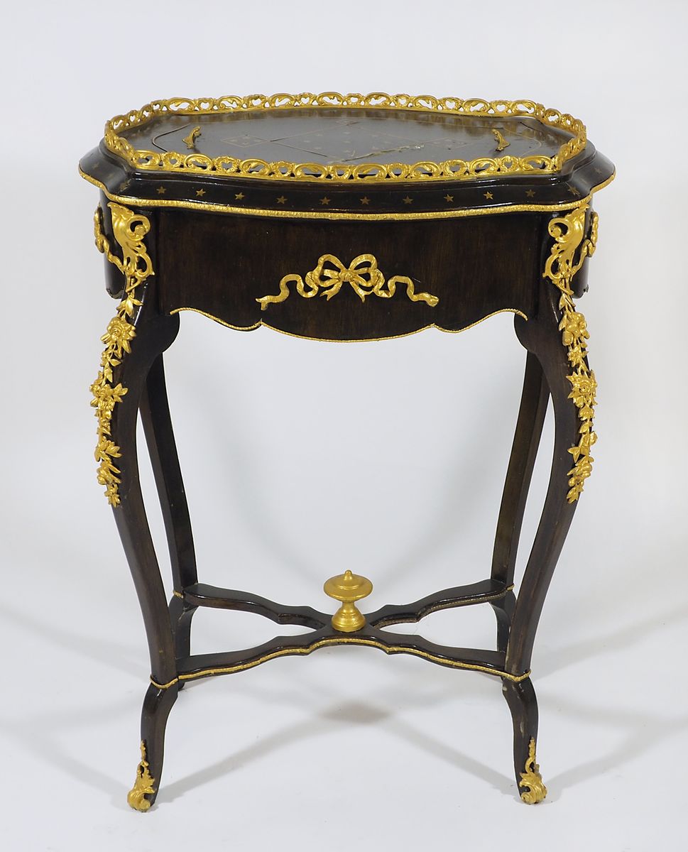 Tavolino ovale in legno con applicazioni in bronzo dorato, piano apribile, gambe a sciabola unte da traversa. XIX sec.