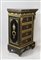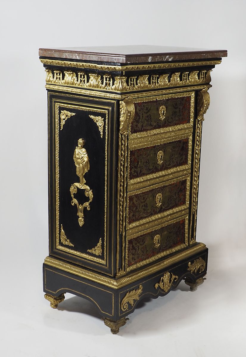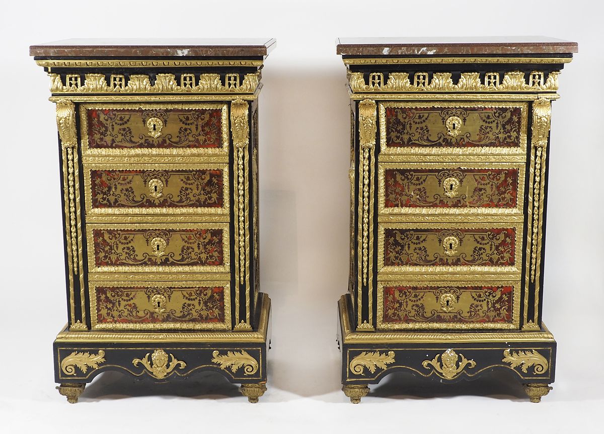 Coppia di grandi comodini a 4 cassetti in legno nero e lavorazione boulle, impreziositi da fregi dorati, piano in marmo. cm. 112x68x44. XIX sec.