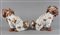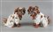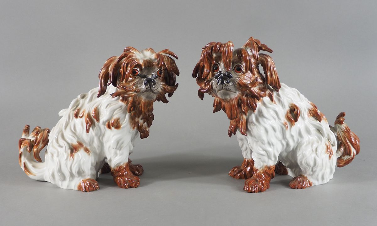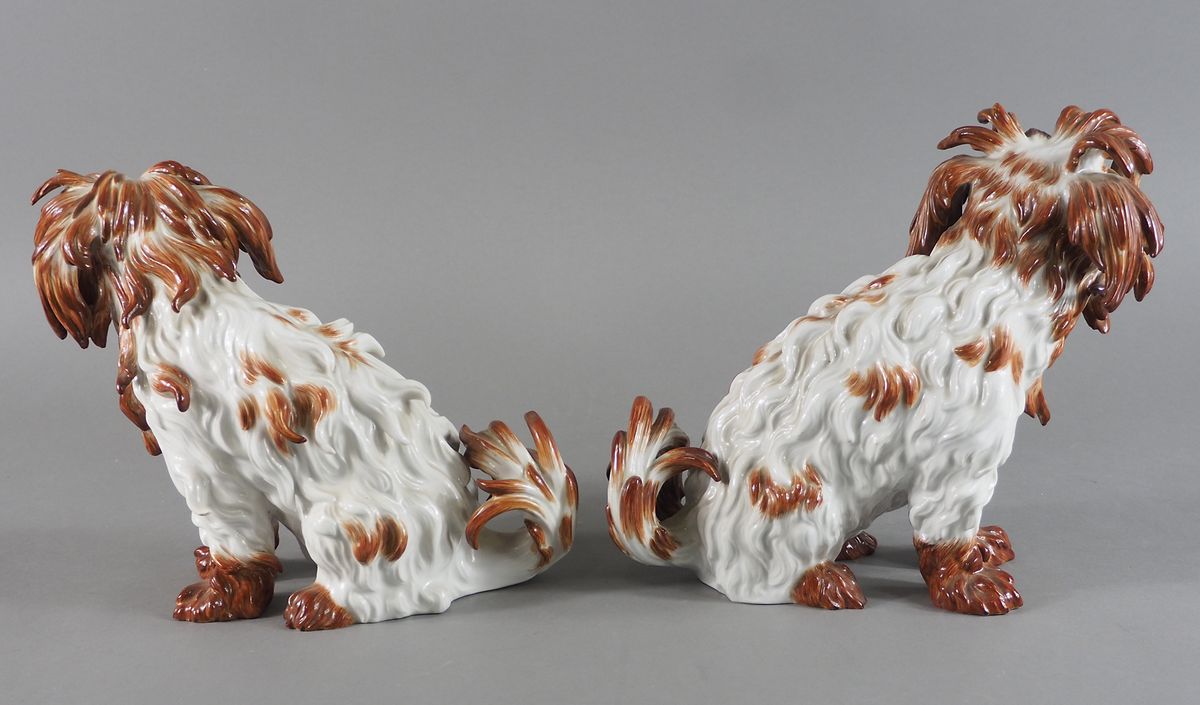 Meissen; coppia di 2 cani in porcellana policroma. Marcati. Lung. cm. 30. (difetti).