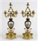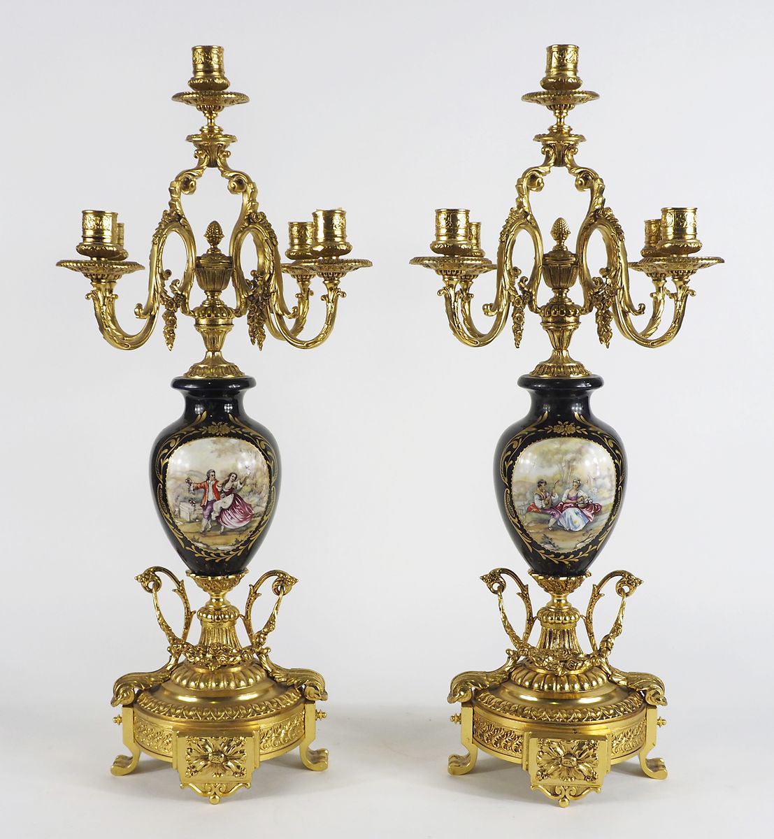 Paio di candelieri a 5 fiamme in porcellana policroma con medaglioni raffiguranti scene galanti, montatura in bronzo dorato. Recano l'iscrizione "ACF deco de Sevres fat a man". H. cm. 69.
