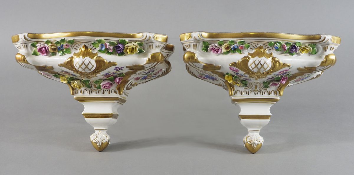 Coppia di mensole da parete in porcellana policroma decorate a motivi floreali. Larg. cm. 23.