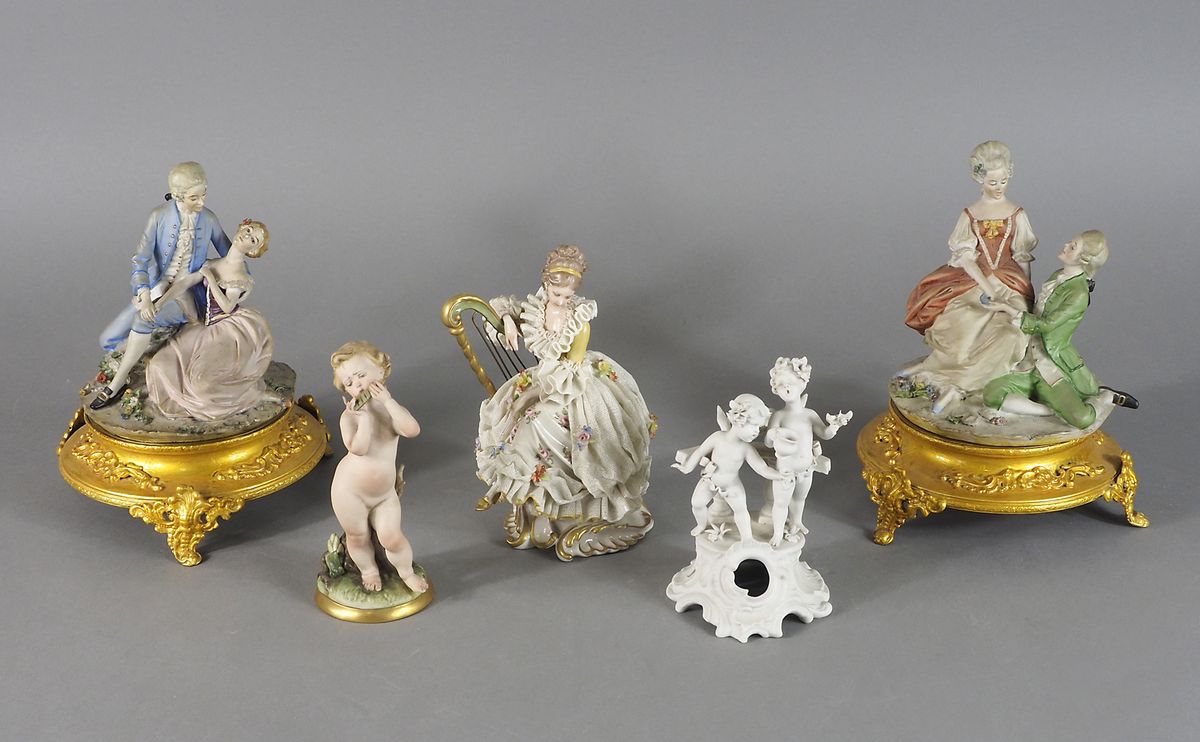 Lotto di 5 statuine in porcellana policroma e bisquit. H. max cm. 23. (difetti).