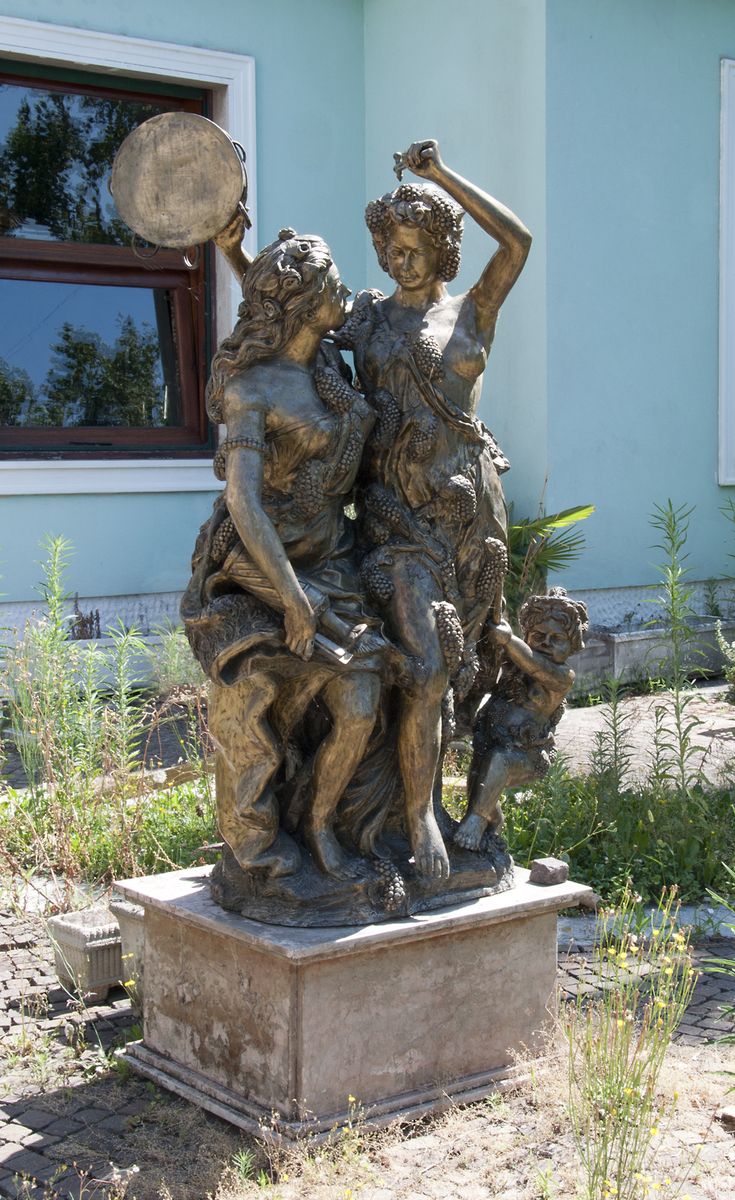 Grande scultura in bronzo raffigurante donne suonatrici e putto. H. cm. 161.