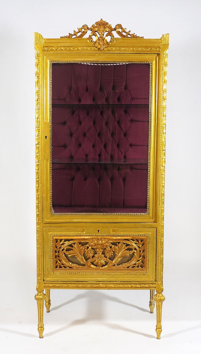 Vetrina da terra in legno dorato con grande anta centrale. cm. 173x70x40.