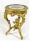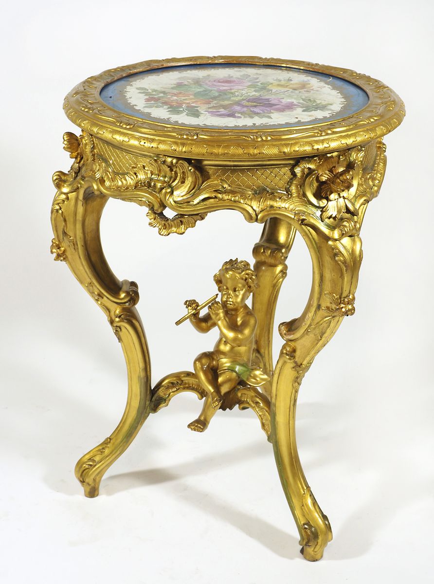 Tavolino rotondo in legno dorato con piano in porcellana policroma decorato a motivi floreali. XIX sec.