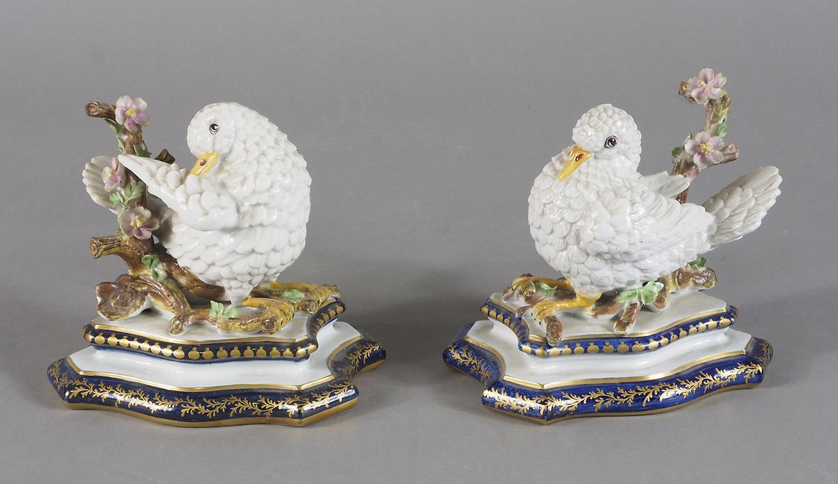 Sevres: due gruppi in porcellana policroma raffiguranti uccelli e alberi in fiore. Lung. cm. 14.