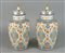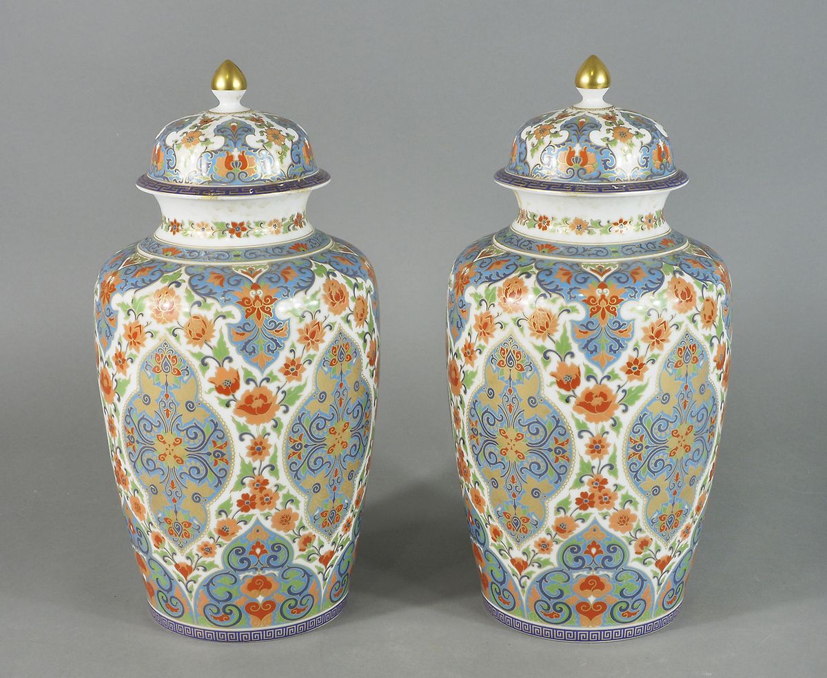 Kaiser: coppia di vasi in porcellana decorati a motivi floreali, con coperchi. H. cm. 33.