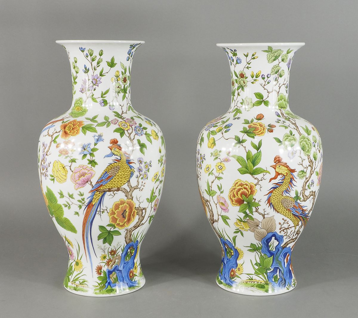 Kaiser: coppia di grandi vasi in porcellana policrmora decorati a motivi floreali e uccelli. H. cm. 45.