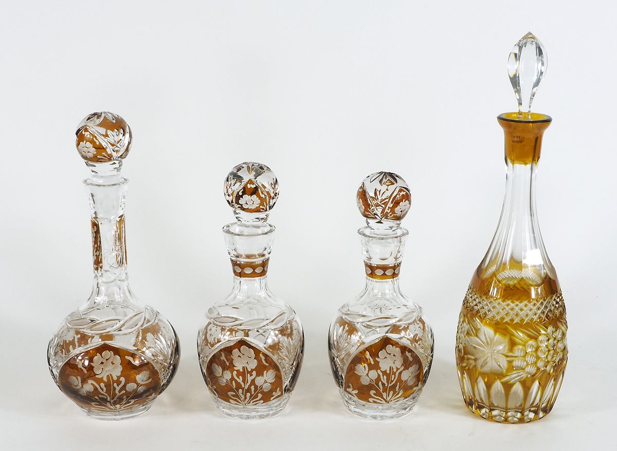 Lotto di 4 brocche in cristallo lavorato, con tappi. H. max cm. 36.