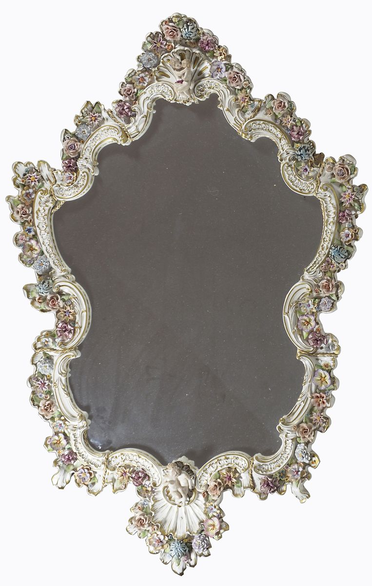 Grande specchiera sagomata con cornice in porcellana policroma decorata con figure di putti e motivi floreali. cm. 133x86.