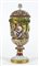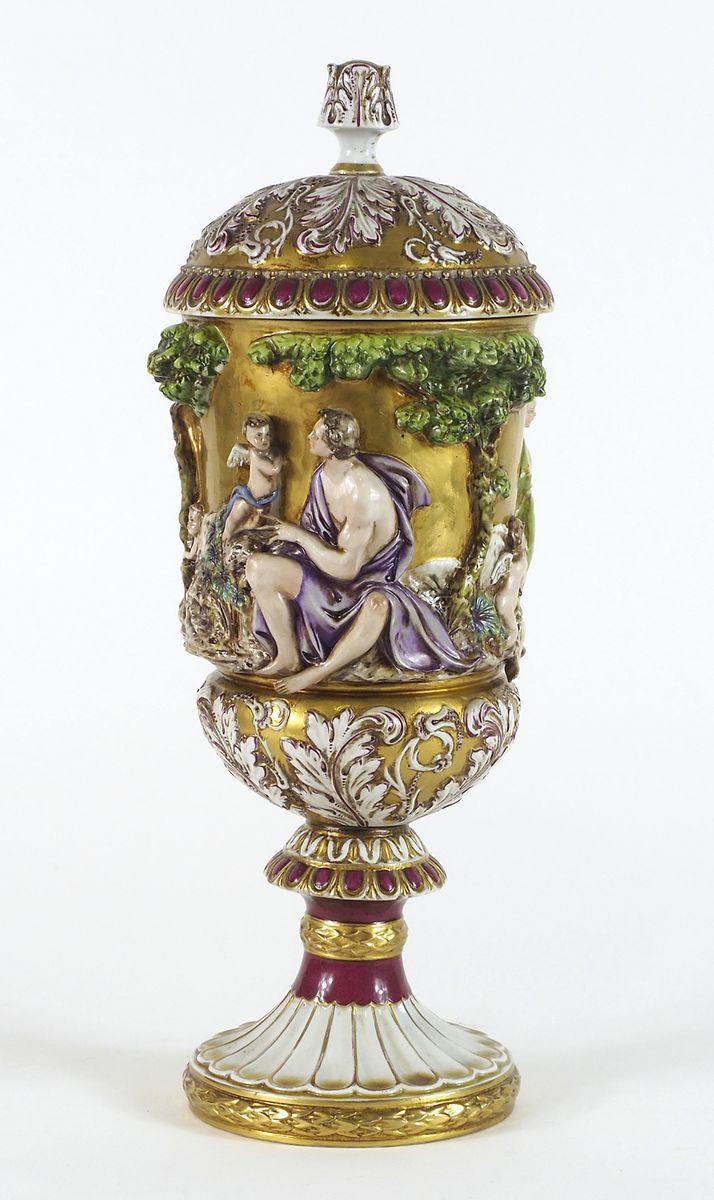 Capodimonte: coppa in porcellana policroma con figre di putti in rilievo, con coperchio. Marcata. H. cm. 41.