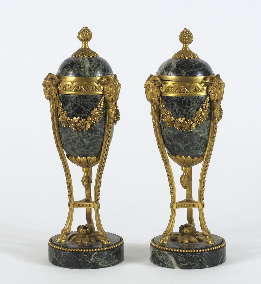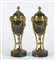 Coppia di vasetti in marmo verde con montatura in bronzo dorato, trasformabili in candelieri. H. cm. 26.