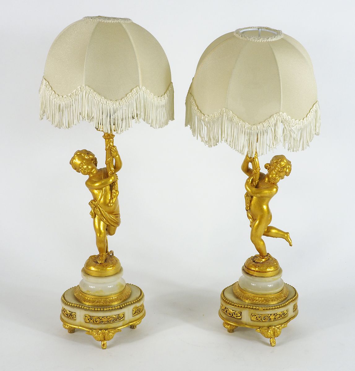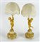 Coppia di lampade da comodino in bronzo dorato con figura di putto, base in marmo, con paralume. H. tot cm. 52.