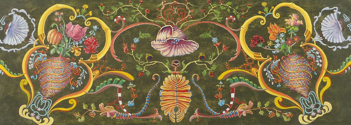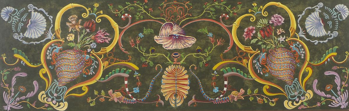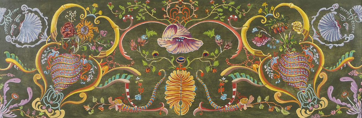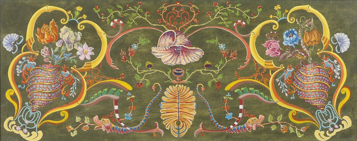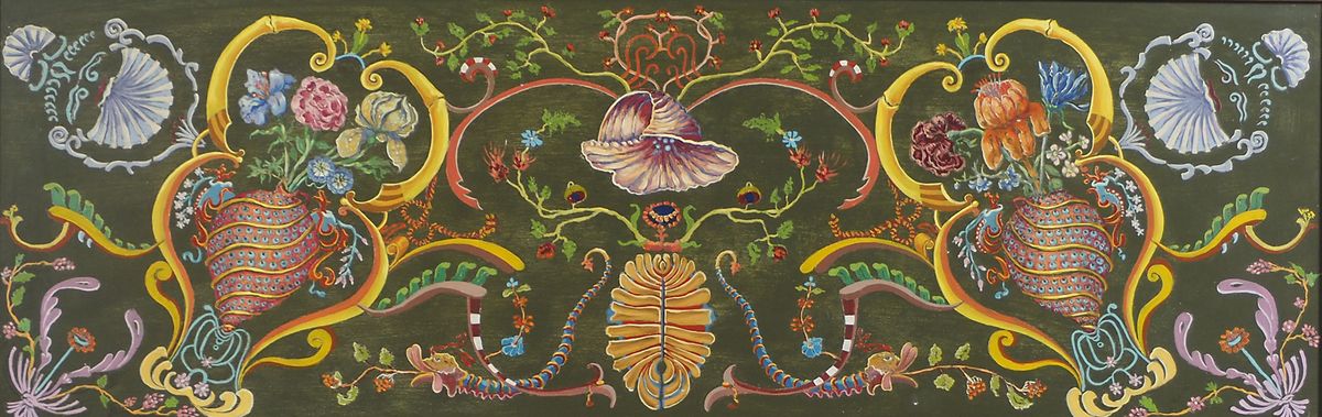 Lotto di 5 sopraporta in legno dipinto, incorniciati. max cm. 30x90-