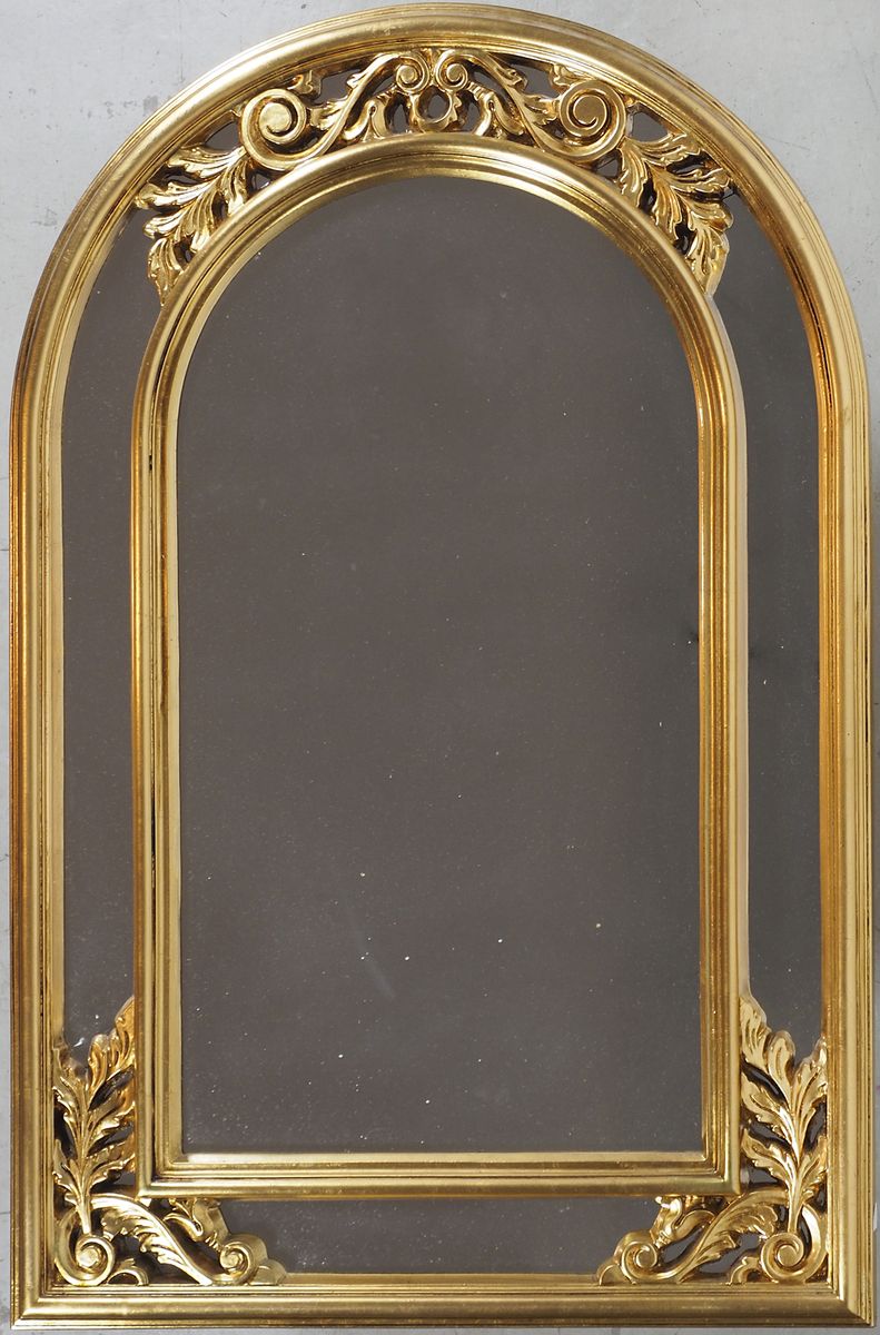 Specchio con cornice a lunetta in legno dorato, cm. 108x71.