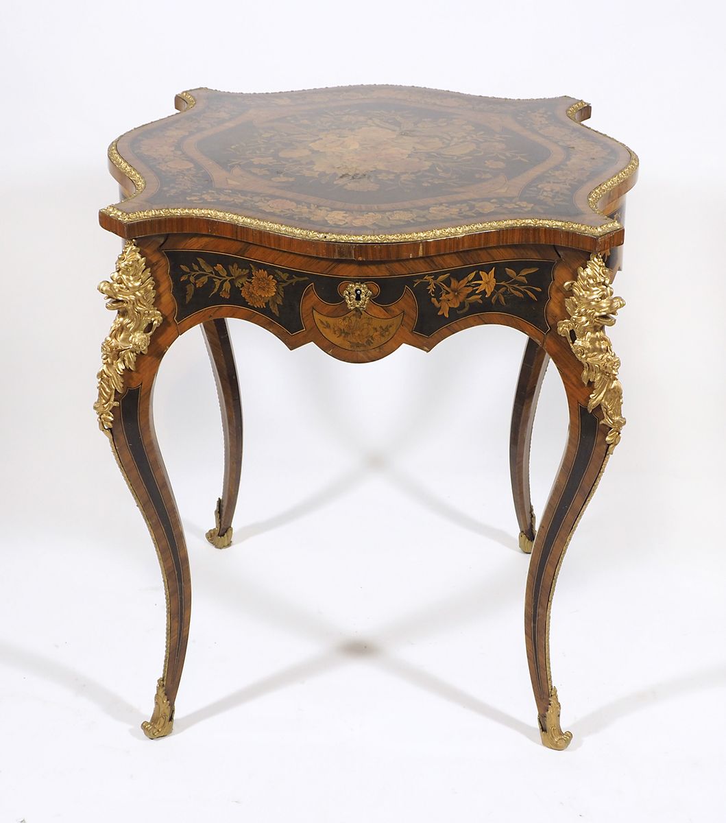 Tavolino da centro in legno decorato a motivi floreali e applicazioni in bronzo dorato, con cassetto. Cm. 74x58x58.