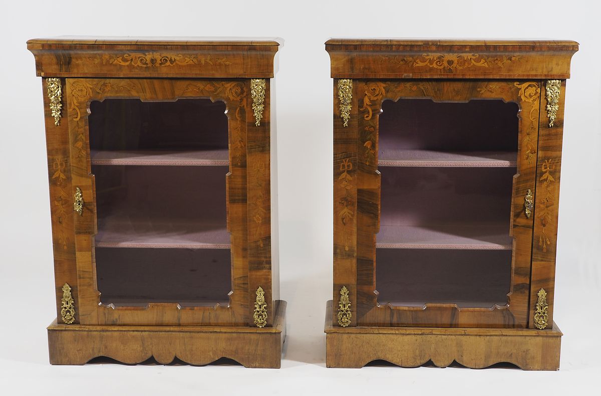 Coppia di moblietti con anta a vetro decorati ad intarsi floreali e applicazioni in bronzo dorato. cm. 107x78x32.