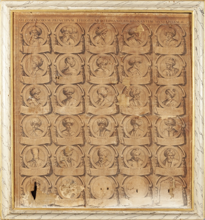 'Re Ottomani' stampa bella cornice Luigi XIV in legno marmorizzato inizi sec.XVIII