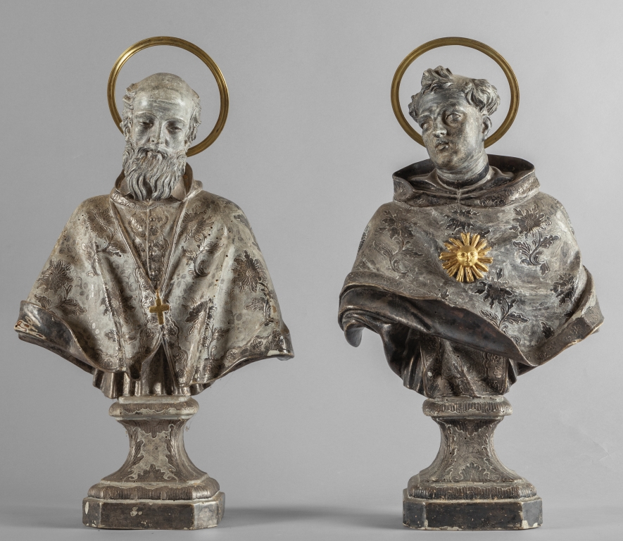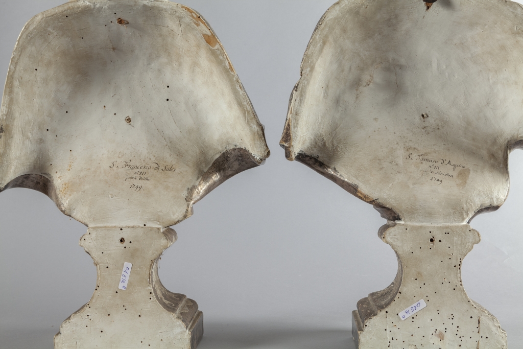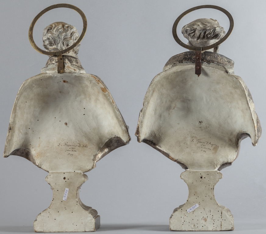 San Tommaso d'Aquino e San Francesco di Sales coppia di busti in legno finemente intagliato ed argentato a mecca datati nel retro Genova sec.XVIII