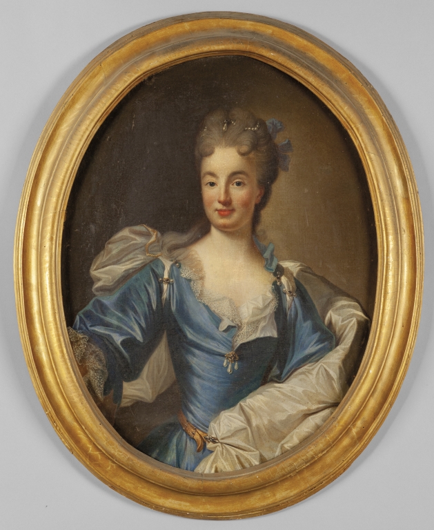 Scuola genovese sec.XVIII 'Ritratto di nobildonna con abito azzurro' olio di forma ovale cornice coeva in legno intagliato e dorato
