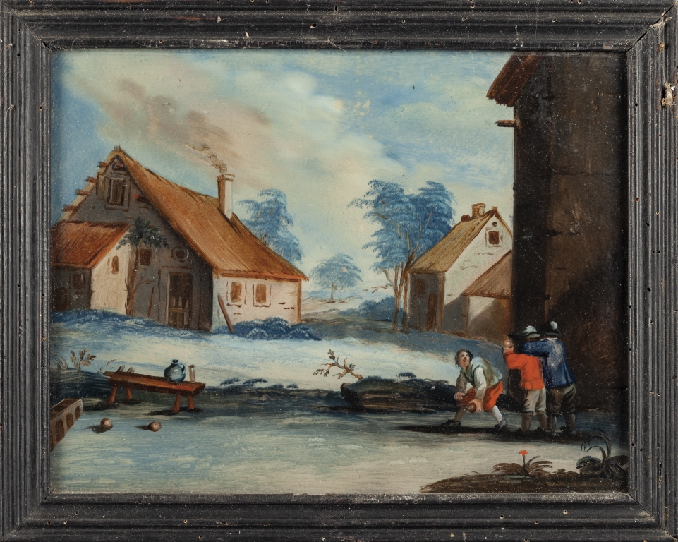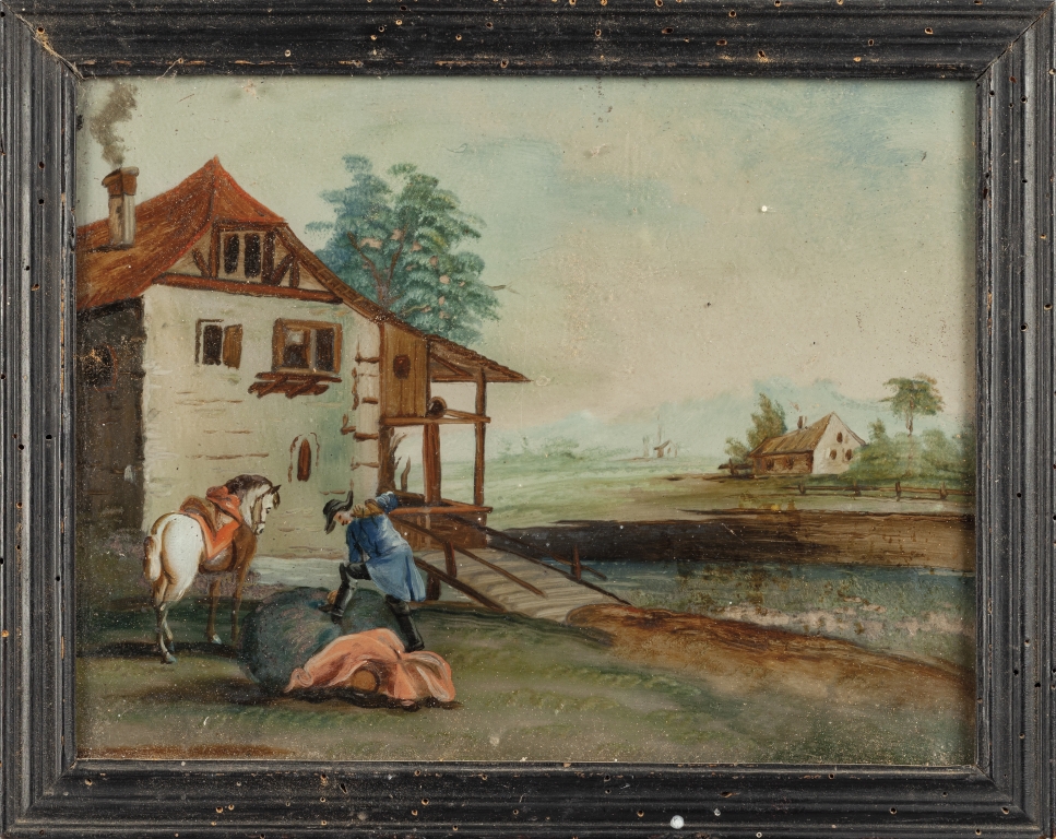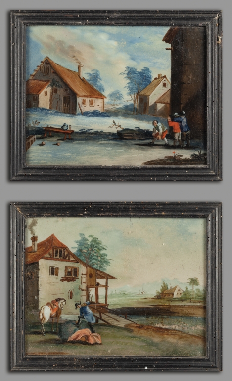 Scuola veneta sec.XVIII 'Paesaggi con figure' coppia di olii su vetro