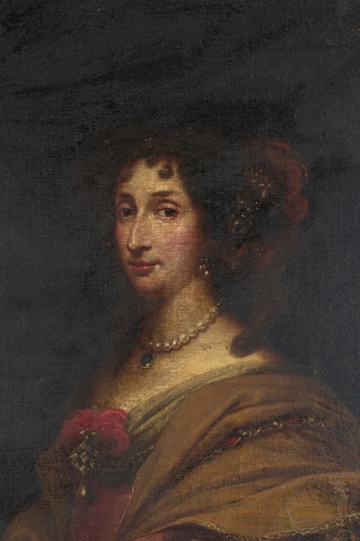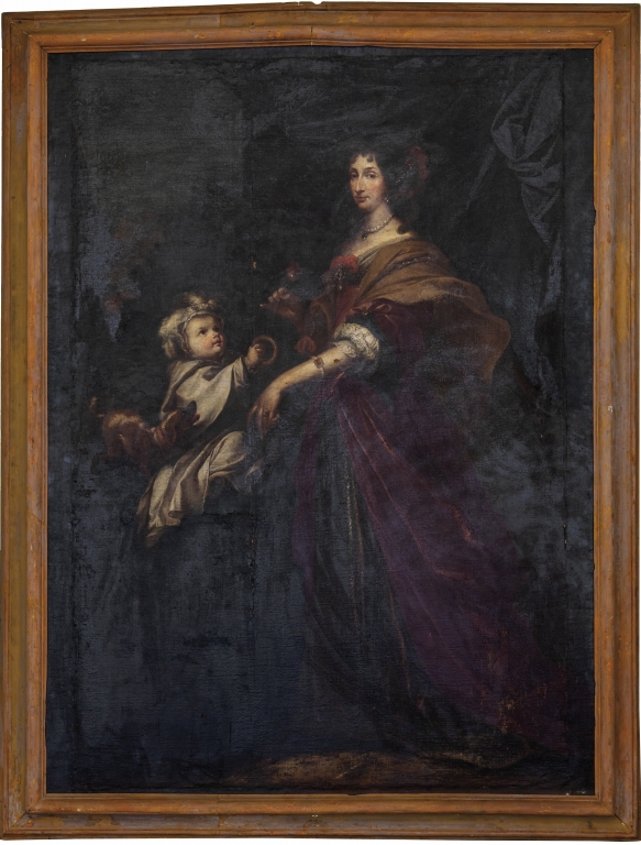 L'inedito da collocarsi certamente in ambito genovese e dunque da datarsi entro la prima metà dell'ultimo decennio del secolo mostra un pittore attento alla tradizione della ritrattistica impostata sui fortunati schemi vandychiani ma attento altresì a infondere quel misto di naturalezza e imponenza barocca che un ritratto di queste dimensioni imponeva. Commissionato da una casata di alto livello e quindi da una delle famiglie del patriziato genovese che anche attraverso questi manifesti pittorici esibivano la ricchezza e il prestigio sociale il dipinto è apprezzabile anche per i dettagli oltre che per l'insieme aulico ed elegante. Il gesto naturale della bimba e l'inserto giocoso del cagnolino riequilibrano quel tono austero della dama che volge lo sguardo fiero verso di noi. Ogni dettaglio del suo abito le sue gioie e l'acconciatura sono messaggi eloquenti del suo status sociale e un auspicabile immediato restauro ne restituirà anche tutta la luminosa bellezza.