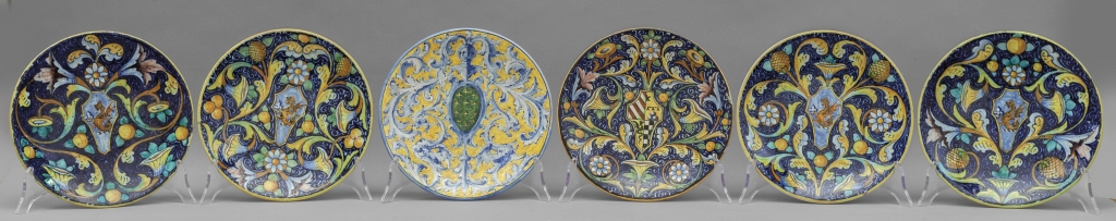 Sei piatti in ceramica policroma decorati a modelli rinascimentali nel retro lettera H