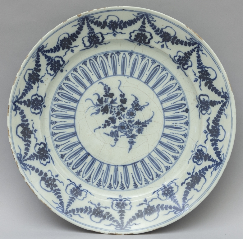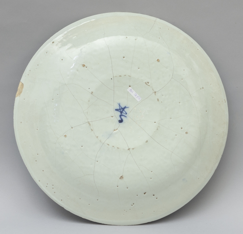 Grande piatto in ceramica di Savona decorato in monocromia blu su fondo bianco nel retro marca Salomone sec.XVIII