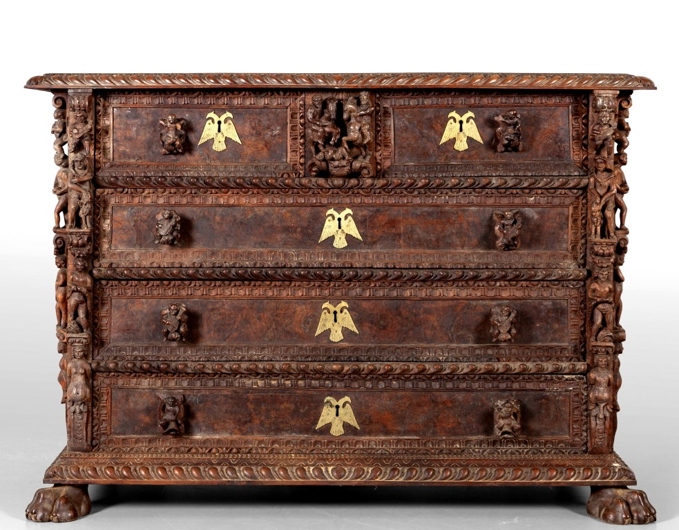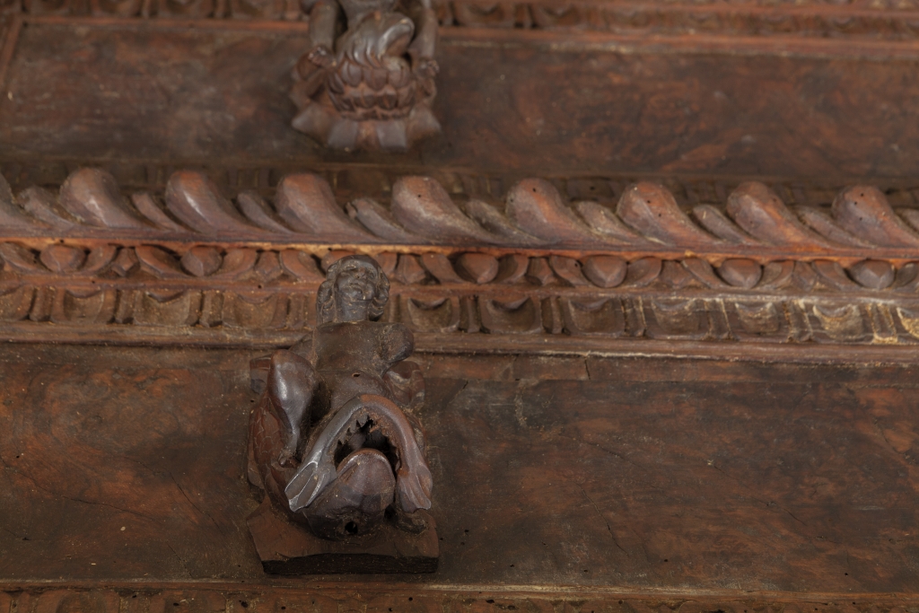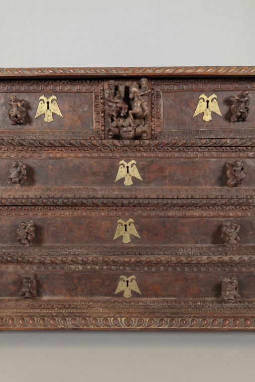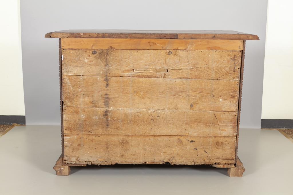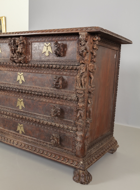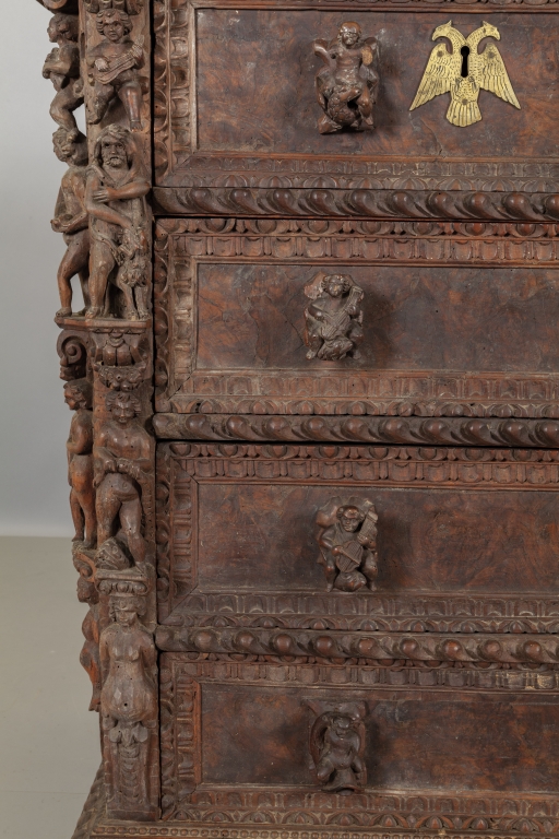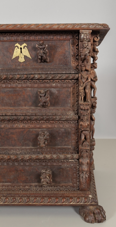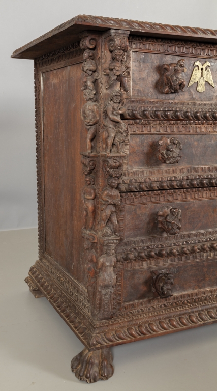 Cassettone a bambocci in noce a tre cassetti grandi più due e cassettino centrale doppio bamboccio sul montante cassetti lastronati in radica prese dei cassetti con figure raffiguranti angeli musicanti a cavallo di aquile delfini e tartarughe Genova sec.XVII