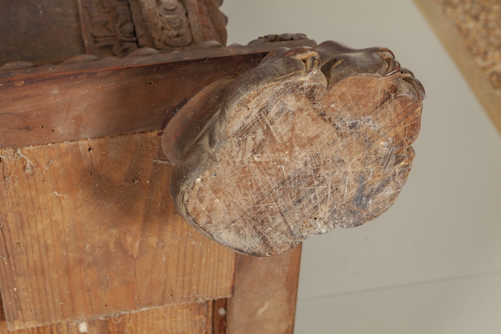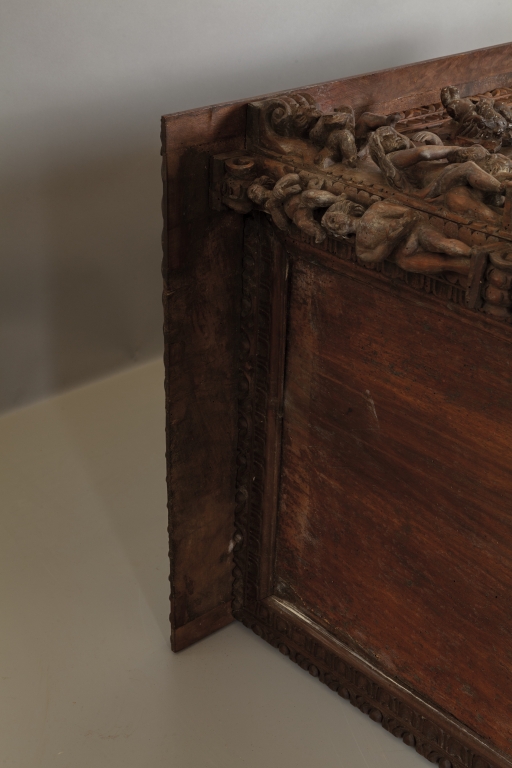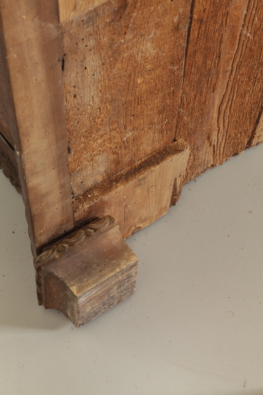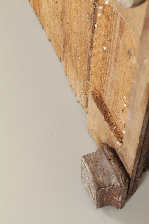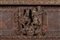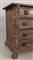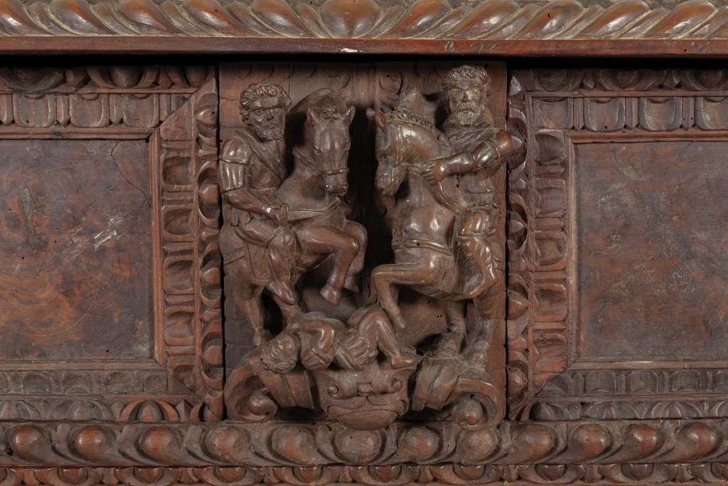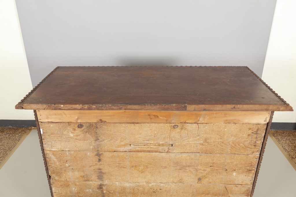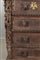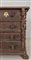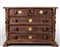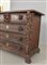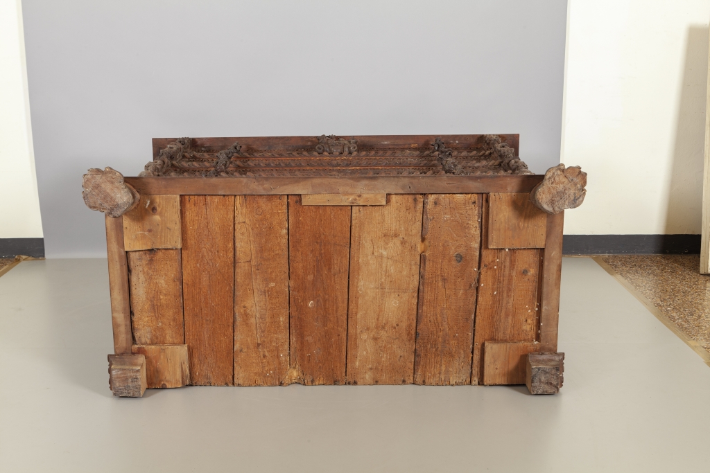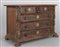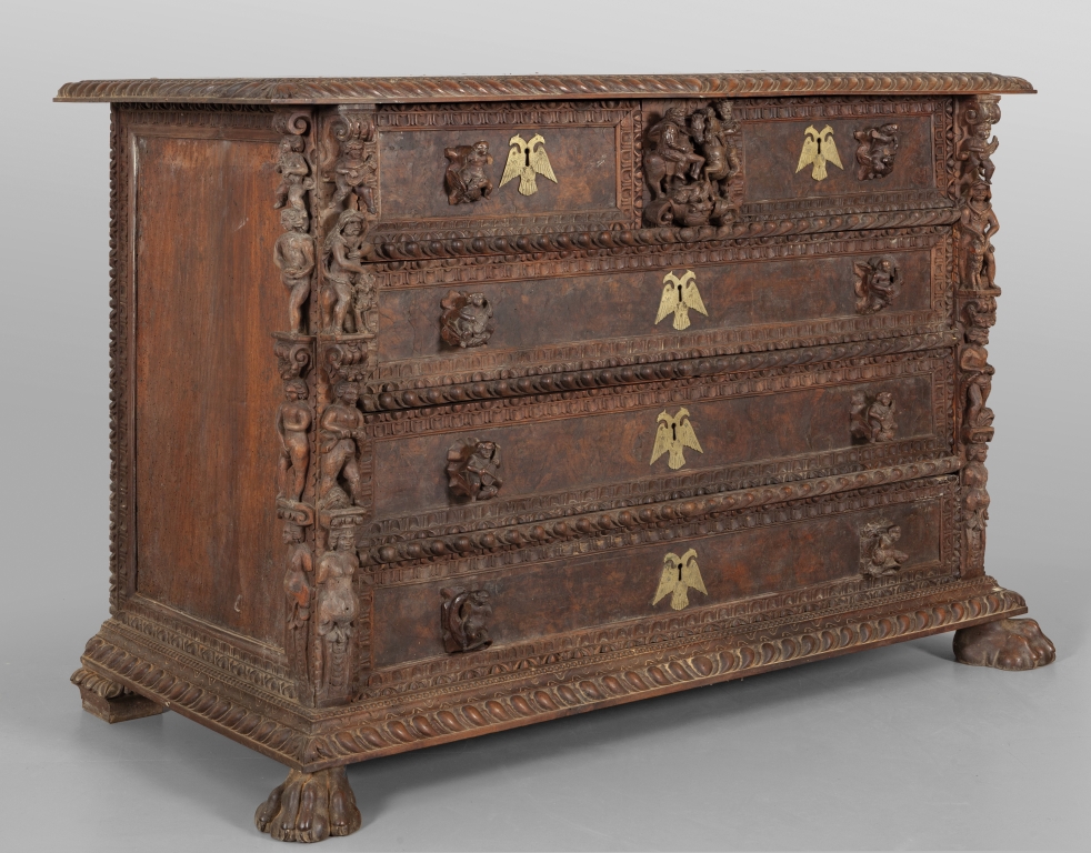 Cassettone a bambocci in noce a tre cassetti grandi più due e cassettino centrale doppio bamboccio sul montante cassetti lastronati in radica prese dei cassetti con figure raffiguranti angeli musicanti a cavallo di aquile delfini e tartarughe Genova sec.XVII