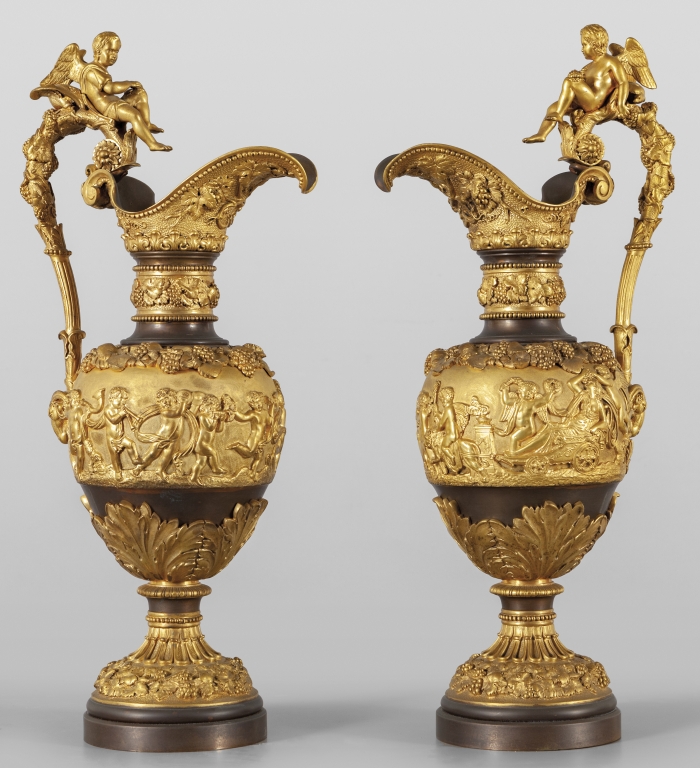 Coppia di modelli di versatoio in rame e bronzo dorato decorati con putti danzanti Francia sec.XIX
