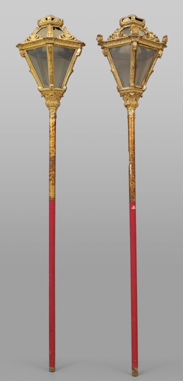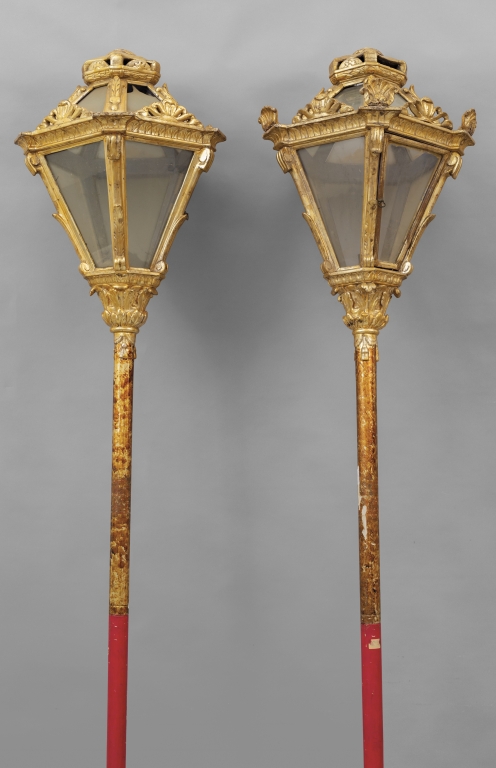 Coppia di lampioni da processione in legno intagliato e dorato bastoni coevi Genova sec.XVIII