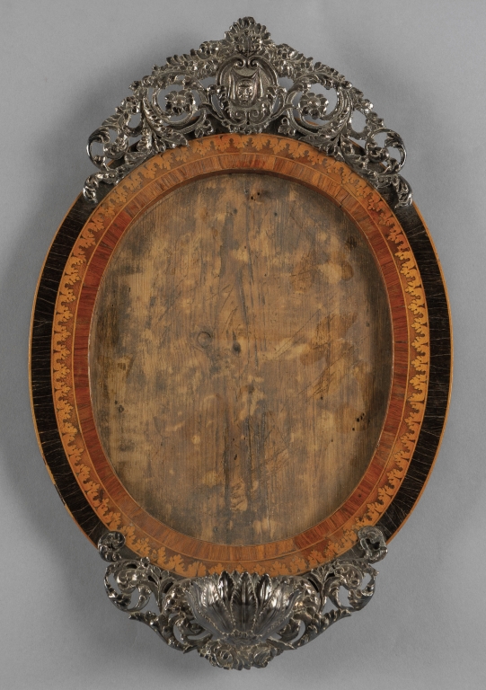 Cornicetta Luigi XVI in legno finemente intarsiato ricca decorazione in argento punzone della Torretta Genova fine sec.XVIII