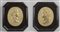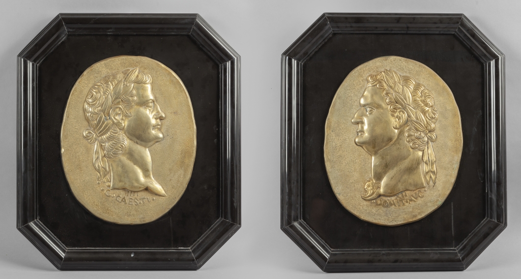 Coppia di medaglioni in rame dorato raffiguranti profili di imperatori montati su cornici in marmo nero del Belgio