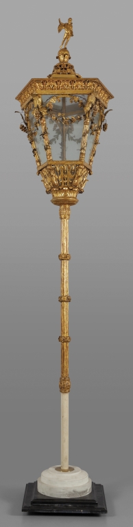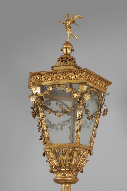 Eccezionale lampione da processione in legno finemente intagliato e dorato a cinque lati con intagli floreali parte superiore con statuina raffigurante il tempo bastone coevo in legno intagliato dorato e laccato Genova I metà sec.XVIII