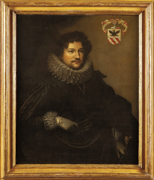 Scuola genovese sec.XVII 'Ritratto di condottiero con stemma nobiliare' olio cornice coeva in legno dorato