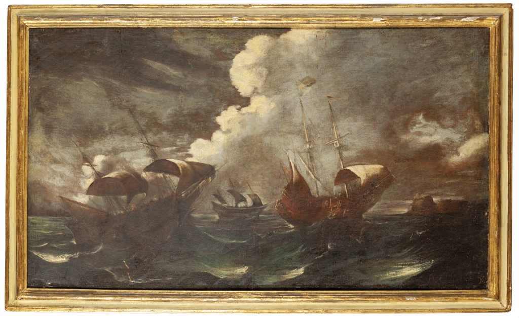 Scuola genovese sec.XVII 'Galeoni nella tempesta' olio
