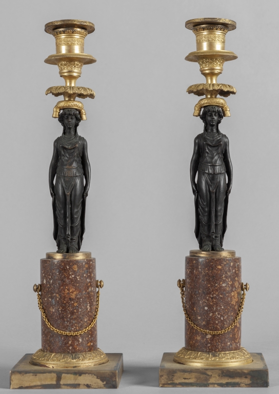 Coppia di candelieri in stile Impero in bronzo brunito e dorato basi in marmo