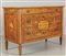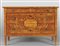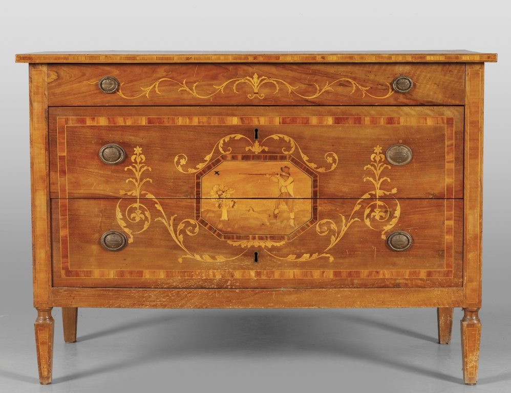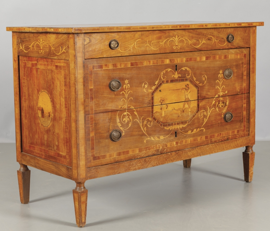 Comò Luigi XVI lastronato ed intarsiato con al centro scena di caccia e rosoni a paesaggi ripetuti sul piano e sui fianchi Lombardia fine sec.XVIII