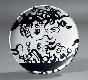 Carla Accardi Trapani 1924 Bianco Nero, 1981 Piatto in ceramica, cm. 41,8 ø Firma e data sul fondo: Accardi 1981 / Deruta. Foto autenticata dall'artista con timbro Studio Accardi, Roma, 07/07/06, con n. 92/06.