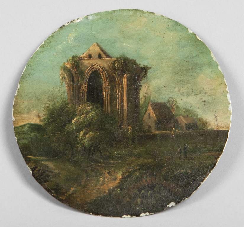 Scuola emiliana sec.XVIII 'Paesaggio con figure' olio su metallo di forma rotonda