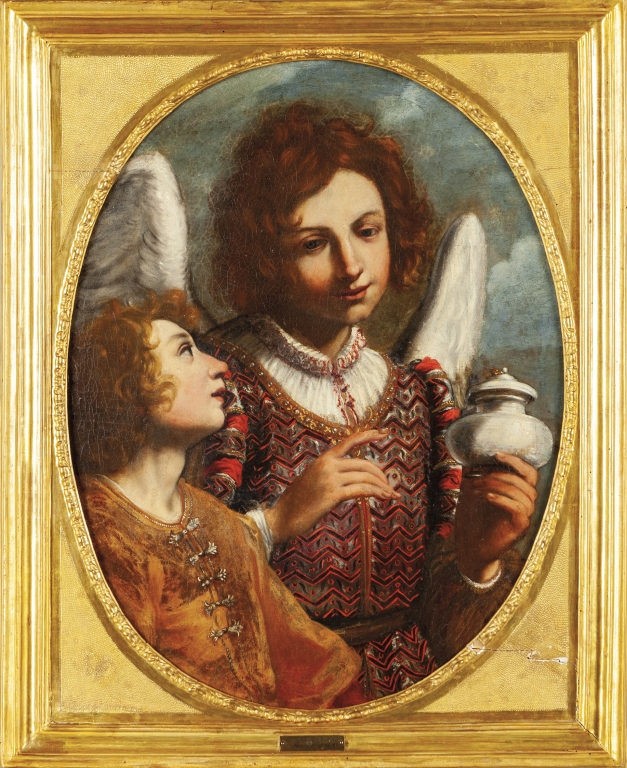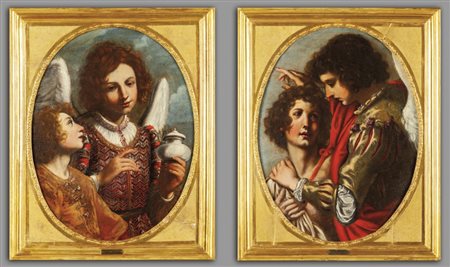 'Angeli Custodi' coppia di olii di forma ovale cornici Luigi XVI in legno intagliato e dorato
