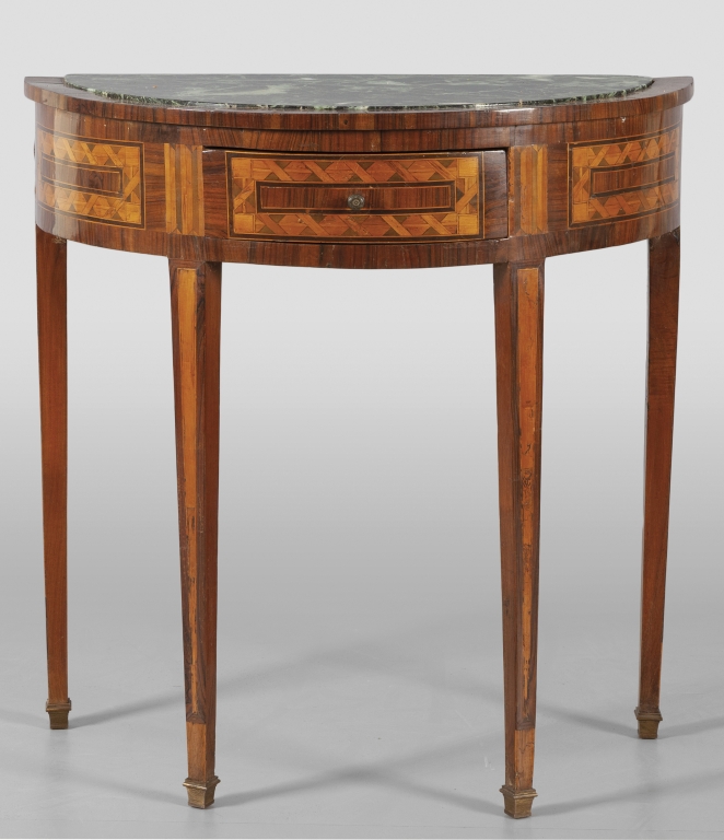 Piccola console a demilune lastronata in palissandro ed intarsiata in legni vari un cassetto nella fascia piano in marmo incassato Piemonte II metà sec.XVIII